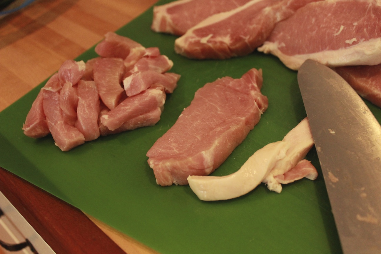 - Cut the pork loin into small 1” to 1.5” thick steaks, then into small cubes.