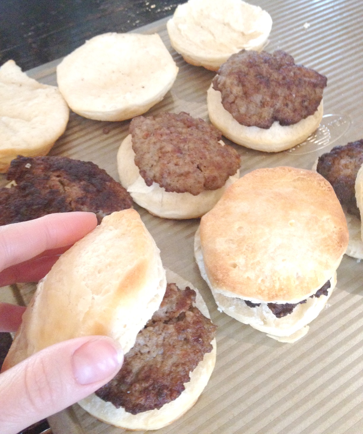 When the biscuits come out, allow everything to cool slightly. Then build the sandwiches. Tear open the biscuit and pop a patty on top.