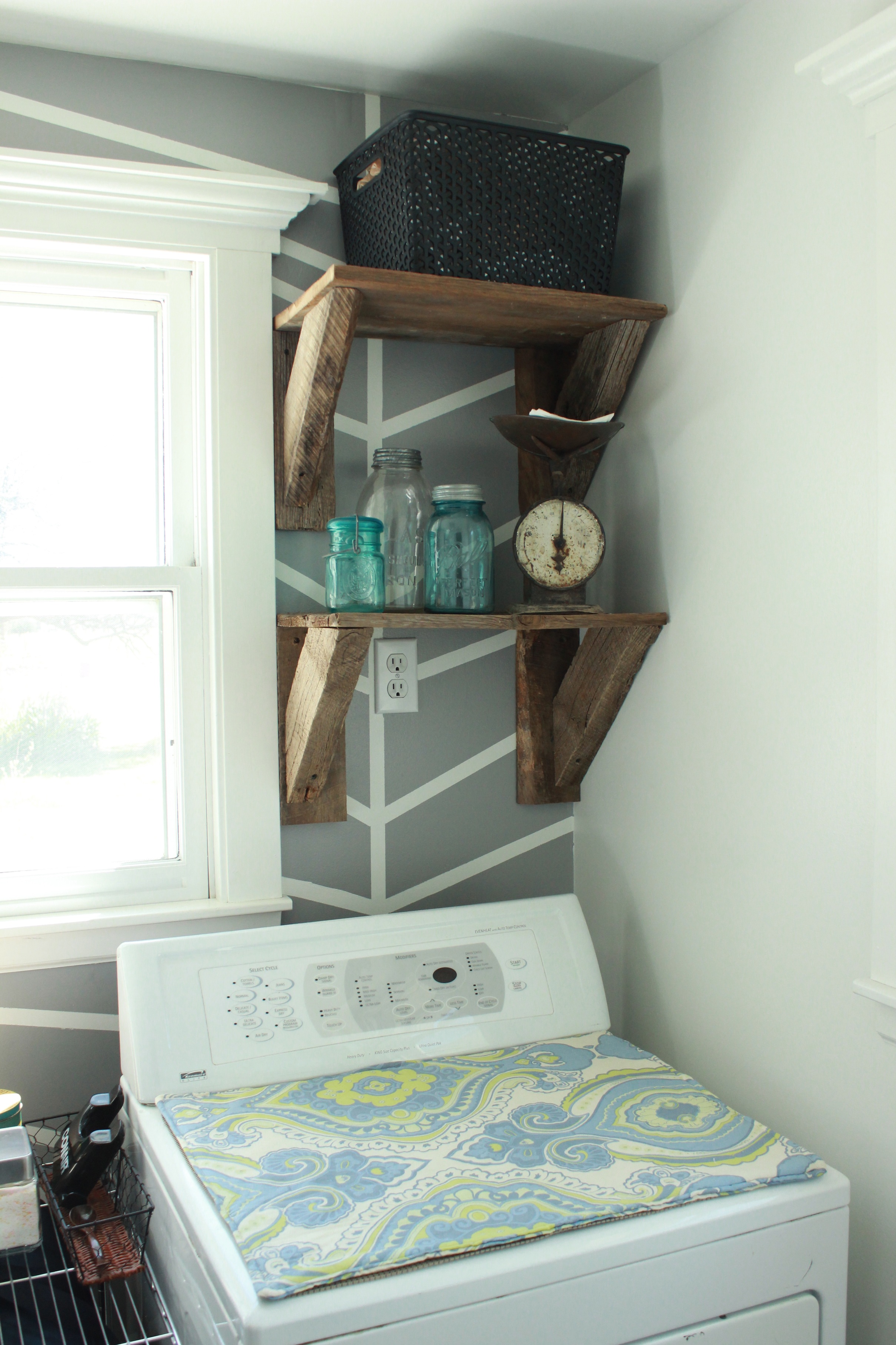 I completed the shelves with space for baskets, pretty mason jars, and an old scale to house my dryer sheets.