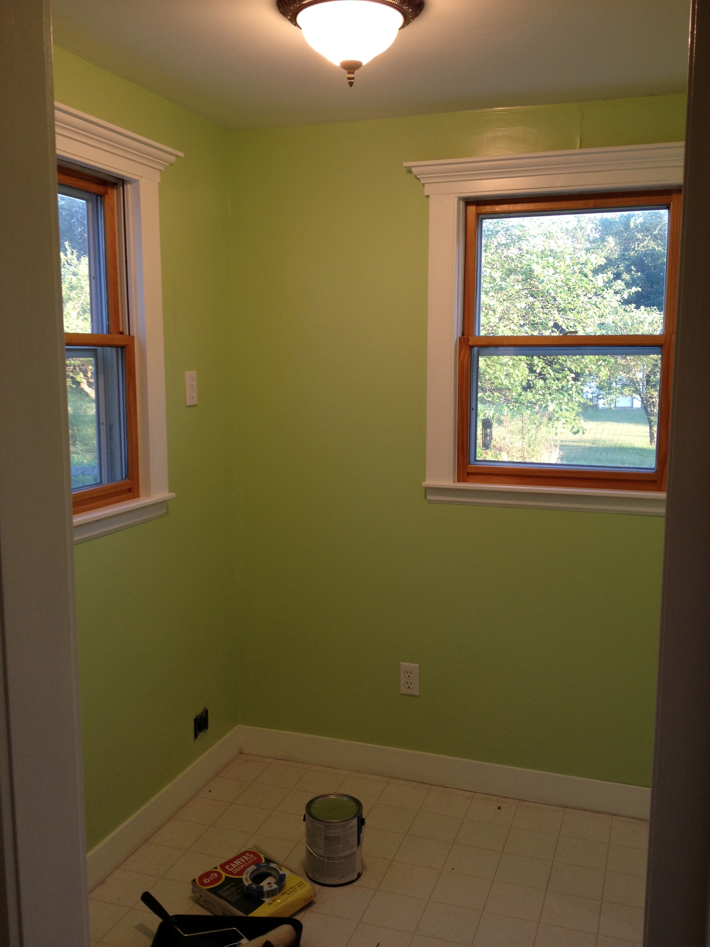 We started with a bright green room. My sister happened to be home one weekend and helped me paint it white. (She was a little discouraged from helping me again when she found our her hard work (3 coats of white) was going to be ripped down for the home addition! Sorry Morgan!)